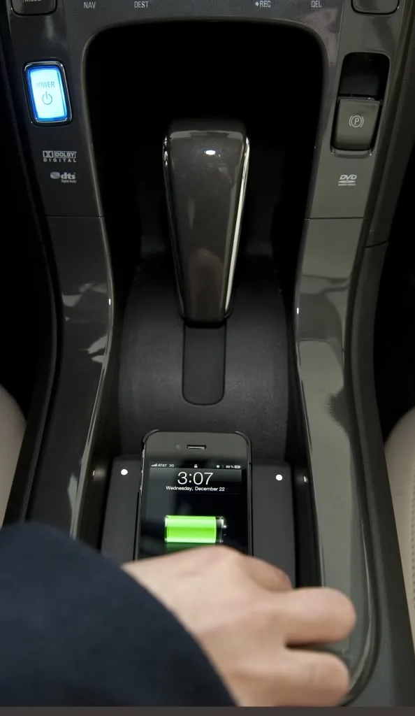 General Motors recently teamed up with Powermat and in 2012, will start outfitting its Chevy Volts with this super cool feature. This mat or charging shelf will be part of the car and will