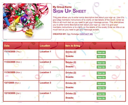 You just click over to the website and pick an existing template, like holiday parties, fundraisers, sports teams, even donation collections. Or upload your own photo or logo to make it more personal. Then just plug in what you need from your volunteers or guests–say, 6 entrees, 10 side dishes, and 257 desserts (see, this is why I don’t coordinate pot-lucks)–and send out an email blast with the link. Everyone can simply sign up for a responsibility and if you take the time to register on the site, it manages all your commitments, and even sends you a confirmation that you can drop right into your calendar.
