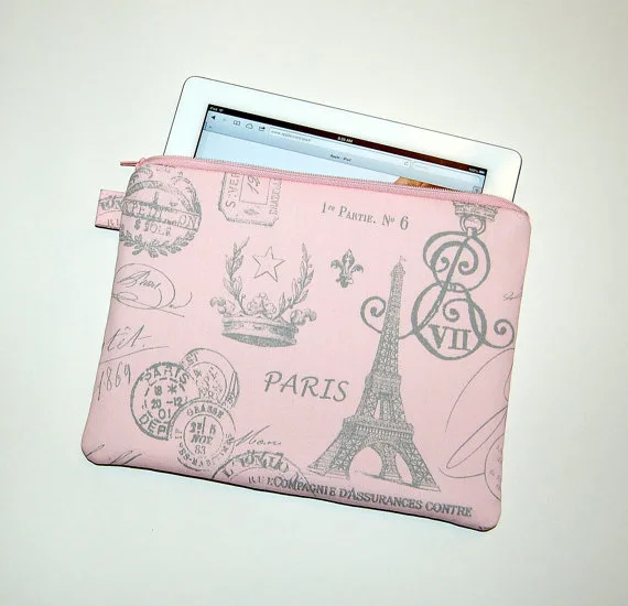 I love the padded French Paris iPad or eReader case from Etsy artist RKEM Designs. It’s designed to fit your iPad, plus the Kindle DX, netbooks under 11 x 8.25″ and even smaller tablet PCs. There are other cute French styles too–just poke around.
