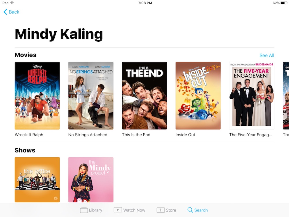 The TV store (i.e., the iTunes store) also recommends other streaming apps or shows you might be interested in, as well as actors you might want to see more from. I can tap on Mindy Kaling’s face and see every movie and TV show she’s in that’s on any of my apps.